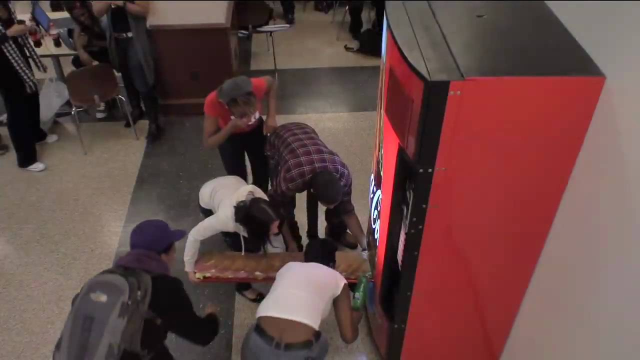 Under different circumstances, the “Happiness Machine” dispensed an array of “goodies” such as pizzas, sunglasses, and… A 12-FOOT LONG SUBMARINE SANDWICH!