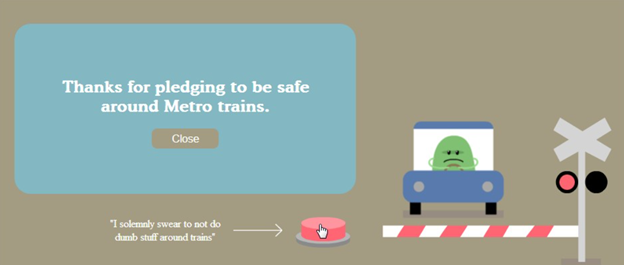 A children’s story book was also made regarding the campaign and posters were placed on Melbourne’s train stations. Every DWTD campaign encouraged viewers to visit Metro Trains’ website and “take the pledge.”